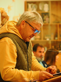 Las paredes del local estaban adornadas de mariposas confeccionadas con libros antiguos, que dejaban volar la imaginación. El terciopelo azul cubría el imaginario estrado en el que las columnas y la mesa en la que se sentó el protagonista y una de las poetisas (Mª Esther García López), desde la que disfrutar de un día que “ha sido como una encerrona, pues no sabía muy bien ni dónde iba ni a dónde venía”, -declaraba el prolífico escritor de más de cuarenta poemarios, que desde la cercanía y los instantes compartidos conectaba e interactuaba inmediatamente con sus lectores.